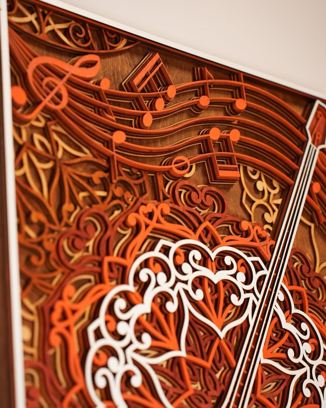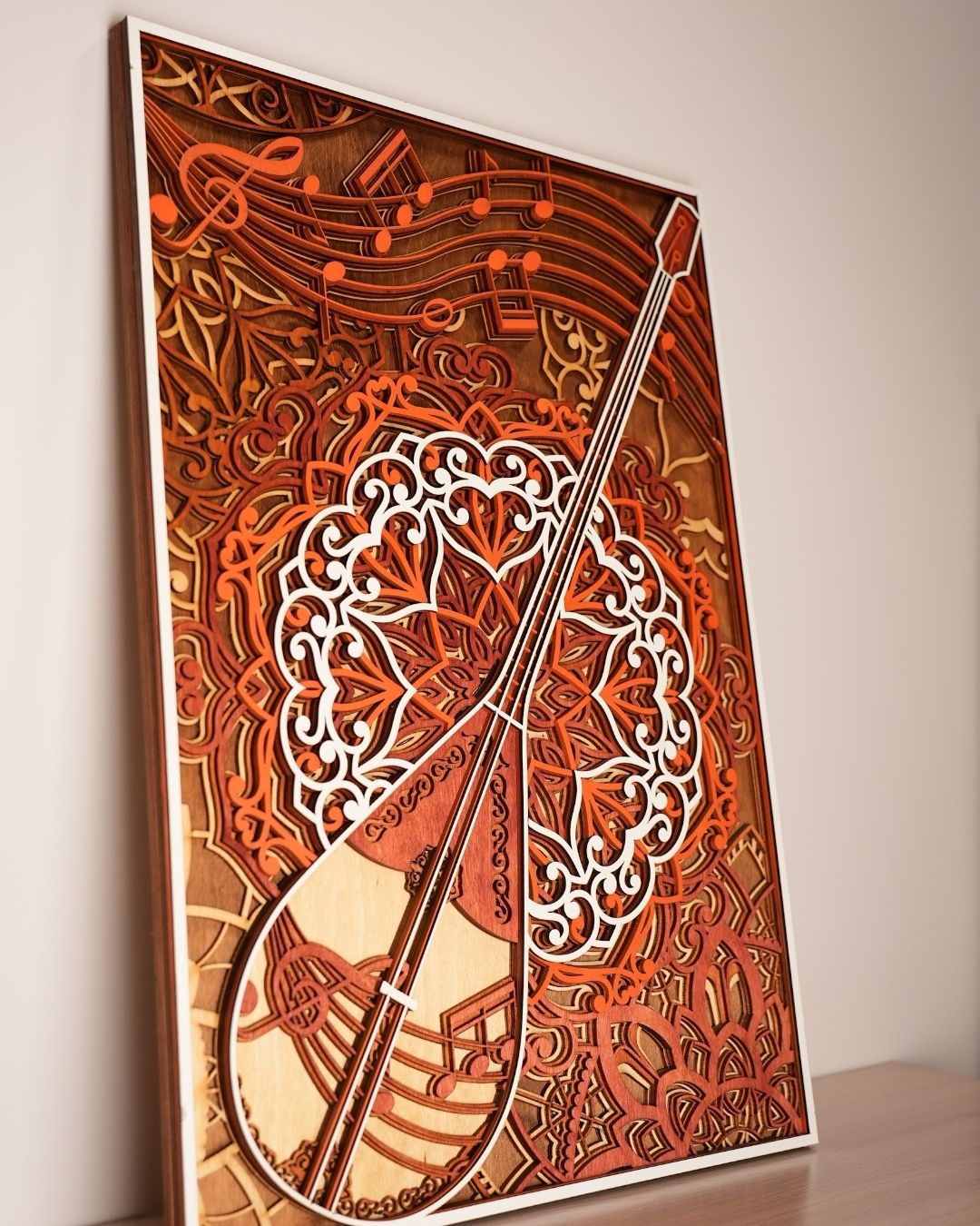 Панно «Домбра» из натурального дерева — стильное настенное украшение, выполненное в технике лазерной резки. Многоуровневая конструкция с национальным казахским орнаментом и музыкальными нотами символизирует богатство культуры и станет ярким акцентом в интерьере.